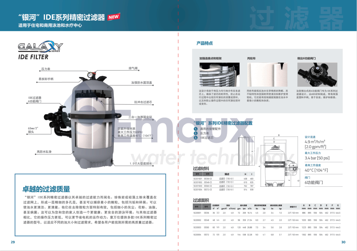 “銀河”IDE系列精密過(guò)濾器以其卓越的過(guò)濾能力而聞名。珍珠巖或硅藻土粉末覆蓋在 過(guò)濾網(wǎng)上,形成一層精細(xì)的多孔層,甚至可以捕獲最小的顆粒,包括污垢和碎屑;可以 使池水更清潔、更清澈。他們?cè)谌コ⒘7矫嫣貏e有效,包括細(xì)小的灰塵、花粉、油脂, 甚至病菌。這可以為您和您的家人創(chuàng)造一個(gè)更健康、更安全的游泳環(huán)境。與其他過(guò)濾器 相比,它的操作壓力更低,可以更節(jié)省電機(jī)的運(yùn)作動(dòng)力。意萬(wàn)仕提供多款I(lǐng)DE系列精密過(guò) 濾器的型號(hào),以適應(yīng)不同的池大小和過(guò)濾需求,希望各用戶能找到所需的高質(zhì)量過(guò)濾器。