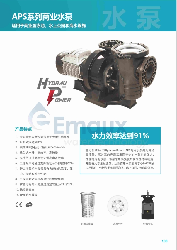 意萬(wàn)仕(EMAUX)Hydrau-Power APS商用水泵是為滿足高流量、高效率的應(yīng)用需求而設(shè)計(jì)的一款功能強(qiáng)大、性能穩(wěn)定的水泵。該泵采用高強(qiáng)度耐腐蝕性材料制造,并配有大容量過(guò)濾籃。這款商用水泵適用于各種不同的應(yīng)用場(chǎng)合,包括各類(lèi)商業(yè)游泳池、水上公園、海水設(shè)施等。