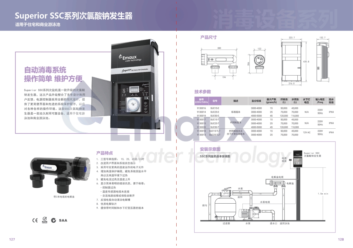 競技池Superior SSC系列次鹽機是一款升級的次氯酸鈉發(fā)生器這次產(chǎn)品升級整合了多年設計和用戶反饋。電源控制器采用全新的現(xiàn)代設計,提供了更簡便界面和先進的系統(tǒng)保護程序,以應對各種各樣的操作環(huán)境。這款SSC次氯酸鈉發(fā)生器是一款經(jīng)久耐用可靠設備,適用于住宅游泳池和商業(yè)游泳池。