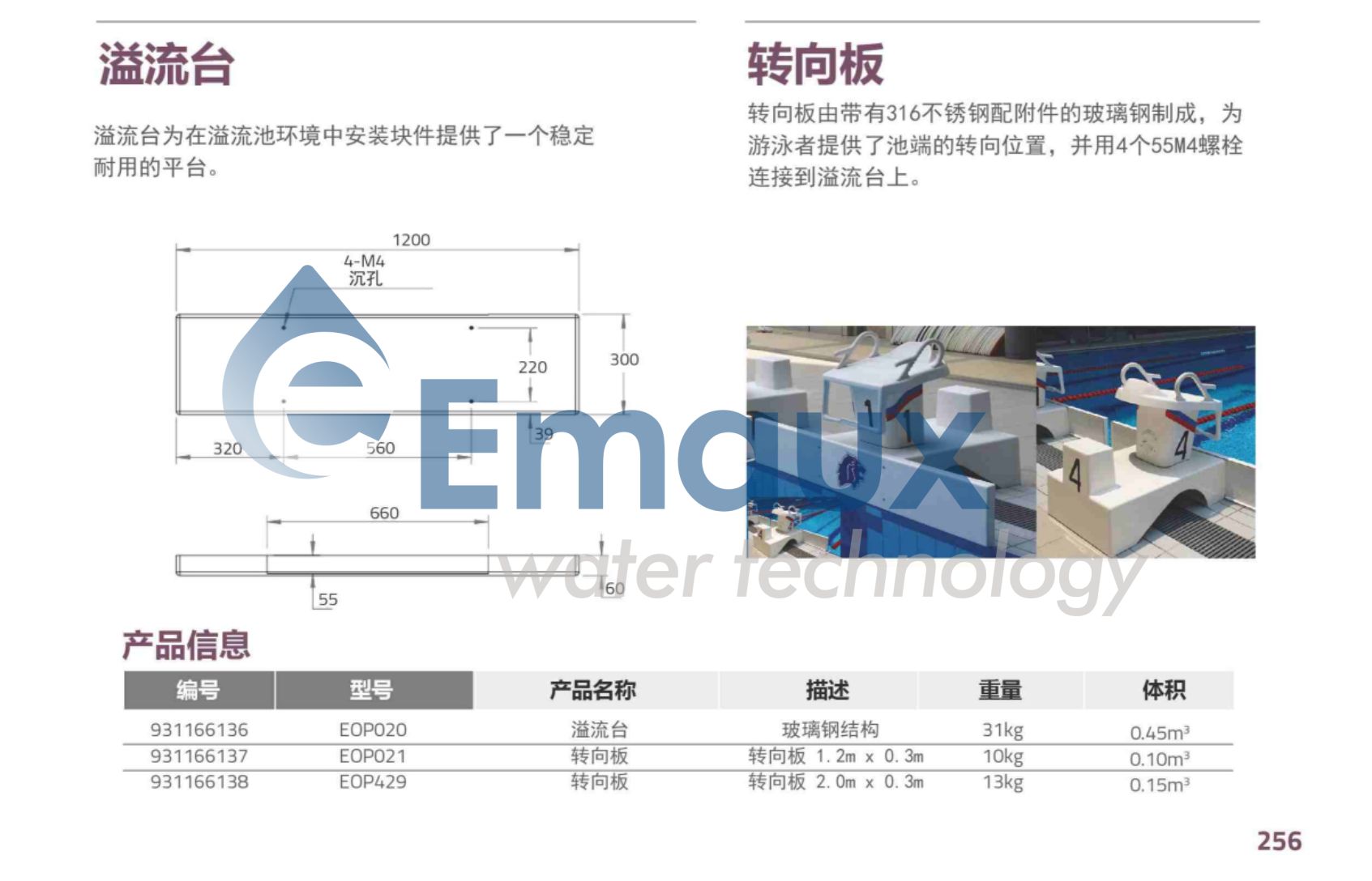 轉向板由帶有316不銹鋼配附件的玻璃鋼制成,為游泳者提供了池端的轉向位置,并用4個 55 M4螺栓連接到溢流臺上。