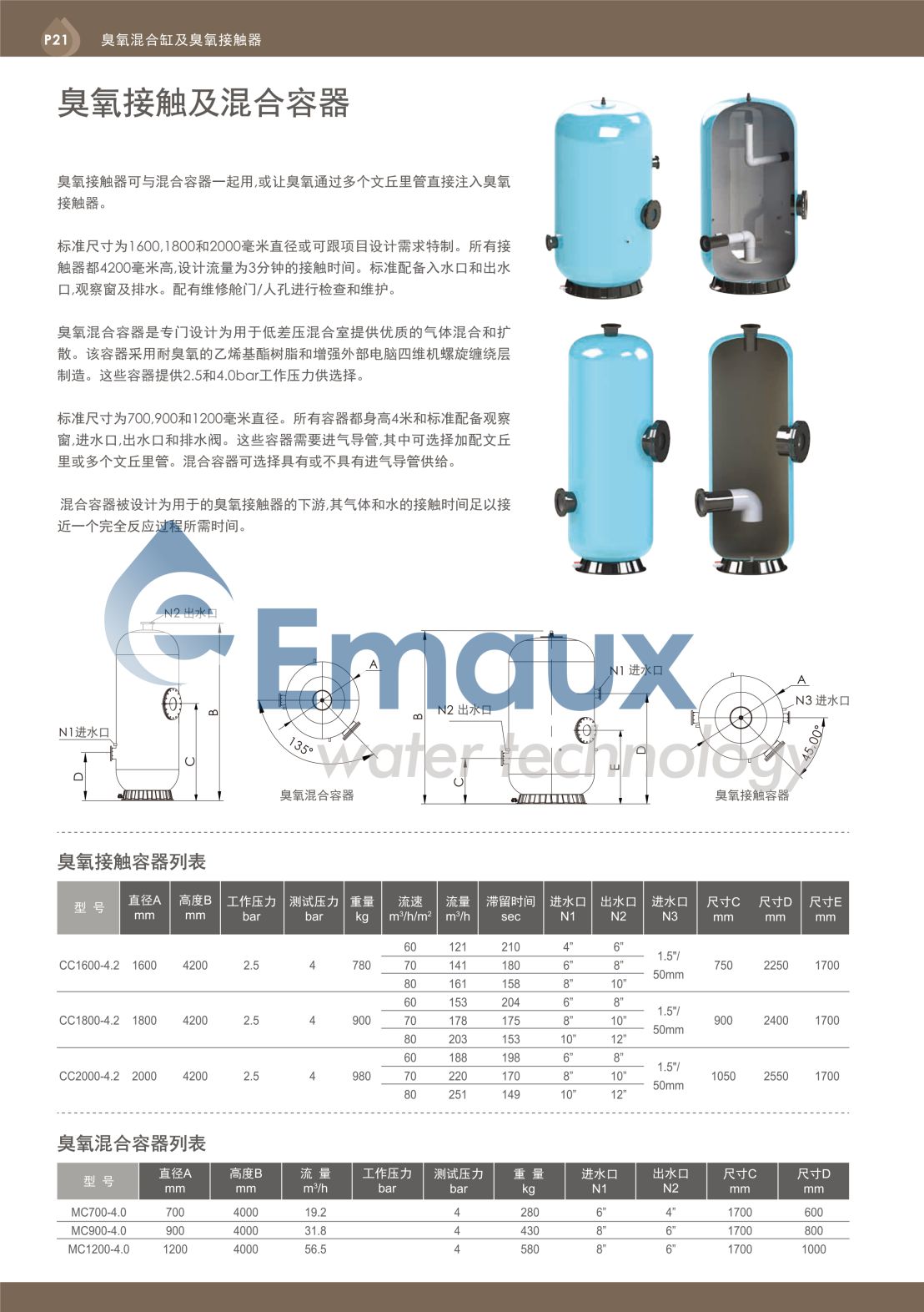 標(biāo)準(zhǔn)尺寸為700,900和1200毫米直徑。所有容器都身高4米和標(biāo)準(zhǔn)配備觀察窗進(jìn)水口,出水口和排水閥。這些容器需要進(jìn)氣導(dǎo)管,其中可選擇加配文丘里或多個(gè)文丘里管?;旌先萜骺蛇x擇具有或不具有進(jìn)氣導(dǎo)管供給。