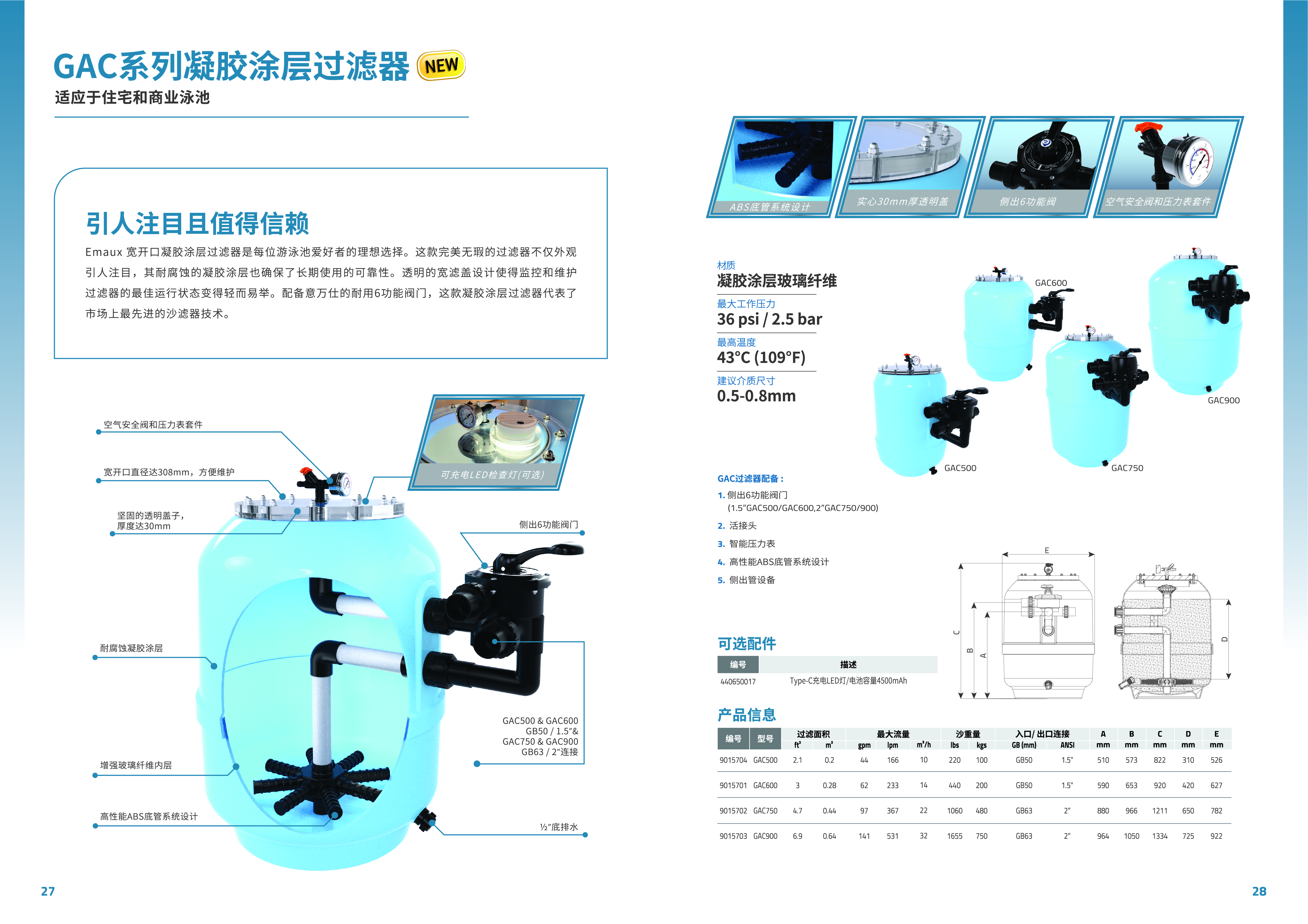競技池Emaux 寬開口凝膠涂層過濾器是每位游泳池愛好者的理想選擇。這款完美無瑕的過濾器不僅外觀 引人注目,其耐腐蝕的凝膠涂層也確保了長期使用的可靠性。透明的寬濾蓋設(shè)計使得監(jiān)控和維護 過濾器的最佳運行狀態(tài)變得輕而易舉。配備意萬仕的耐用6功能閥門,這款凝膠涂層過濾器代表了 市場上最先進的沙濾器技術(shù)。