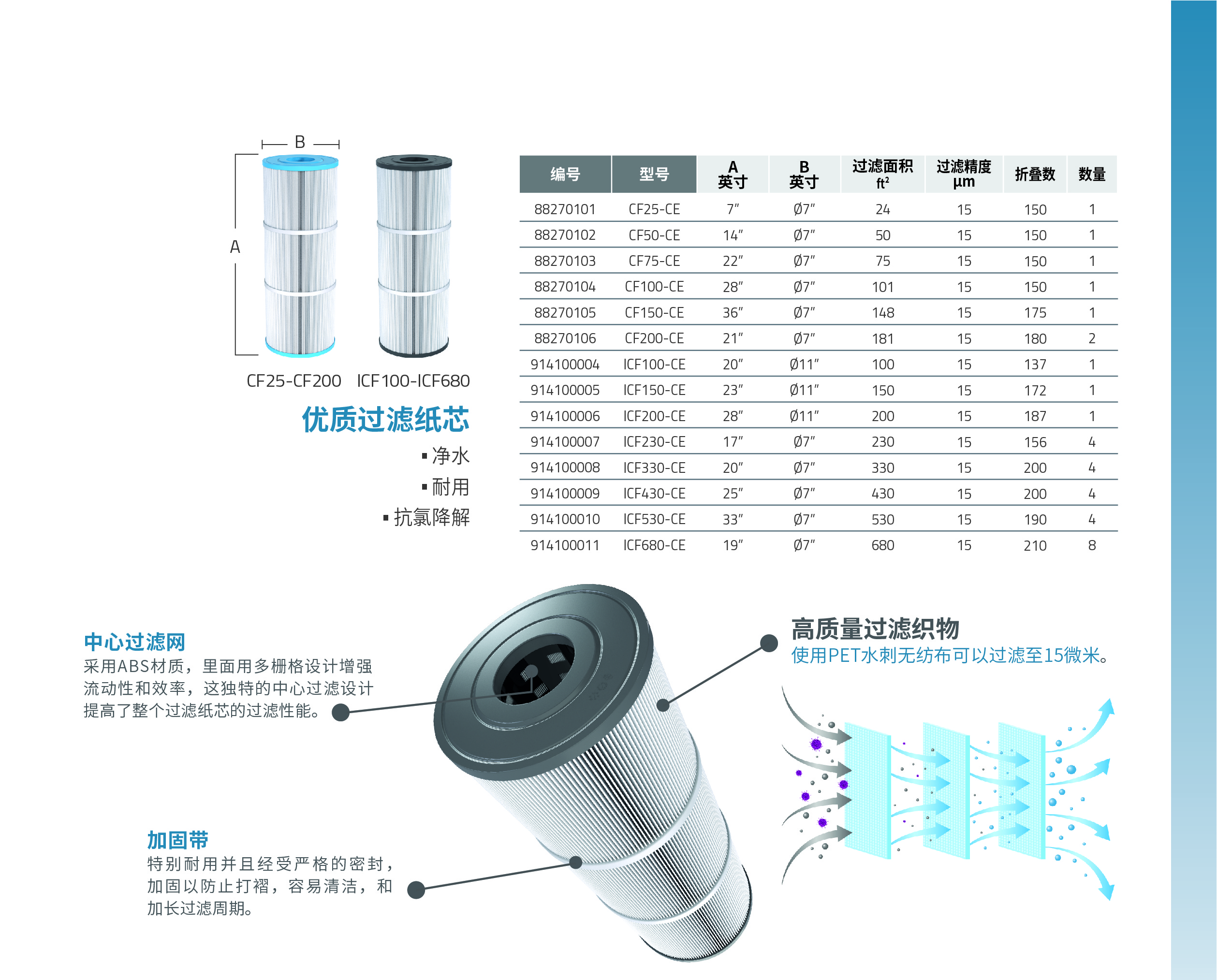 意萬仕過濾紙芯是一種先進(jìn)的過濾解決方案,旨在提升泳池水質(zhì),確保游泳環(huán)境更加清潔和健康。這些濾 芯采用高密度材料制造,提供多種微米等級和材料選擇,能夠有效過濾小至5微米的顆粒,去除水中的沉積 物、污垢和污染物。 意萬仕過濾紙芯采用優(yōu)質(zhì)織物材料,能夠有效過濾泳池或水療池水中的污垢、碎屑和其他顆粒。其設(shè)計堅 固耐用,配備穩(wěn)固的框架和優(yōu)質(zhì)材料,能夠抵抗氯降解,滿足過濾需求。 與意萬仕過濾器兼容,安裝和維護(hù)簡單,是泳池業(yè)主的理想選擇。我們提供多種尺寸和配置,確保您能找 到適合特定泳池或水療池的過濾元件。 通過使用意萬仕過濾紙芯,用戶不僅能享受到卓越的水質(zhì)清澈度,還能提升過濾系統(tǒng)的使用壽命和效率。 為了保持水質(zhì)清潔、清澈且無污染,意萬仕過濾紙芯是最佳選擇。讓意萬仕創(chuàng)新的過濾紙芯升級您的泳池 體驗!