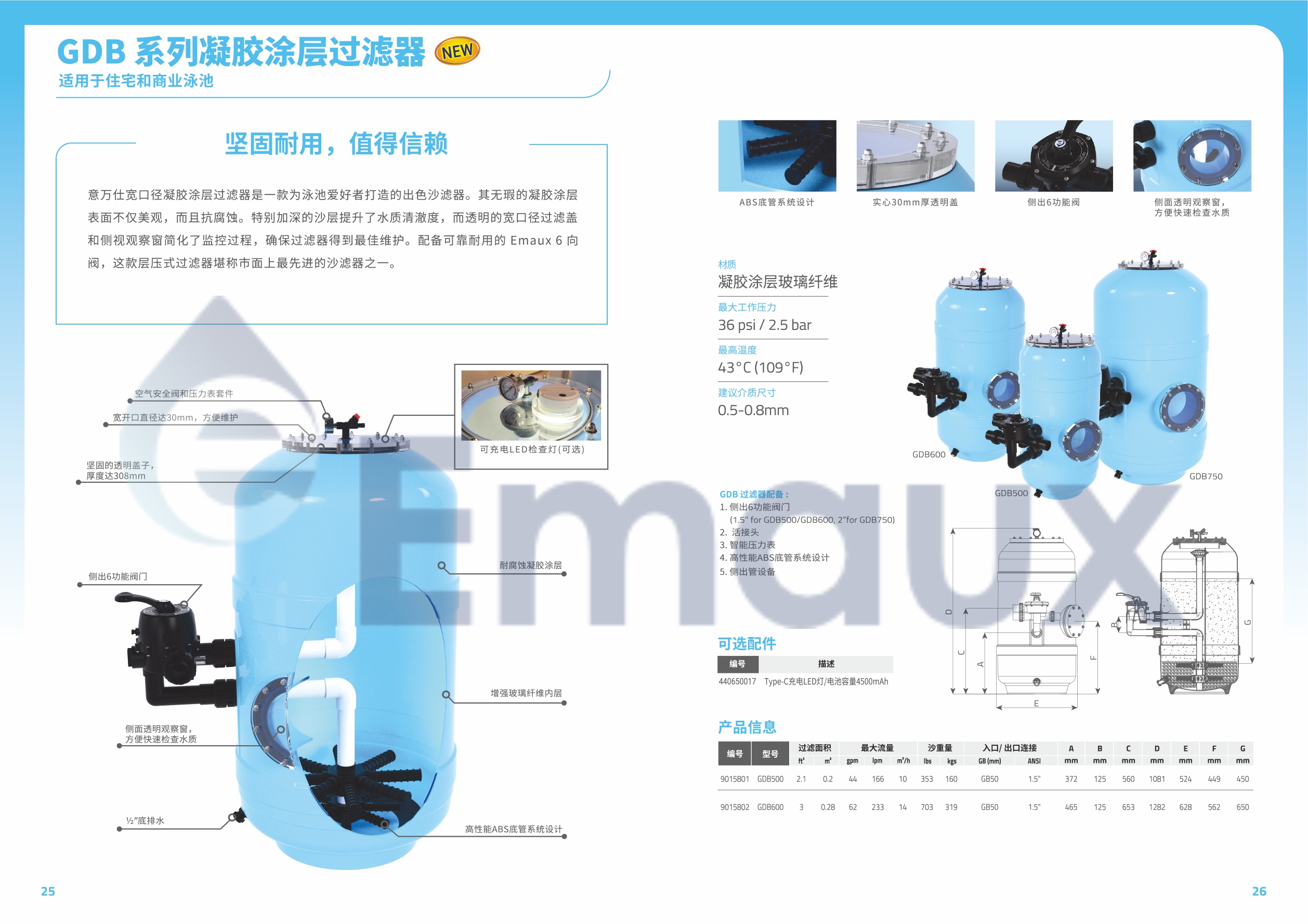 意萬仕寬口徑凝膠涂層過濾器是一款為泳池愛好者打造的出色沙濾器。其無瑕的凝膠涂層 表面不僅美觀,而且抗腐蝕。特別加深的沙層提升了水質(zhì)清澈度,而透明的寬口徑過濾蓋 和側視觀察窗簡化了監(jiān)控過程,確保過濾器得到最佳維護。配備可靠耐用的 Emaux 6 向 閥,這款層壓式過濾器堪稱市面上最先進的沙濾器之一。