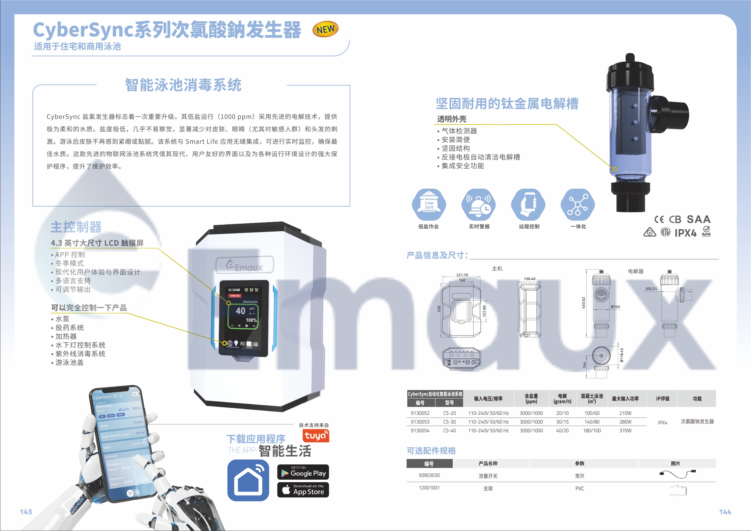 CyberSync 鹽氯發(fā)生器標(biāo)志著一次重要升級。其低鹽運(yùn)行(1000 ppm)采用先進(jìn)的電解技術(shù),提供 極為柔和的水質(zhì)。鹽度極低,幾乎不易察覺,顯著減少對皮膚、眼睛(尤其對敏感人群)和頭發(fā)的刺 激。游泳后皮膚不再感到緊繃或黏膩。該系統(tǒng)與 Smart Life 應(yīng)用無縫集成,可進(jìn)行實(shí)時監(jiān)控,確保最 佳水質(zhì)。這款先進(jìn)的物聯(lián)網(wǎng)泳池系統(tǒng)憑借其現(xiàn)代、用戶友好的界面以及為各種運(yùn)行環(huán)境設(shè)計(jì)的強(qiáng)大保 護(hù)程序,提升了維護(hù)效率。