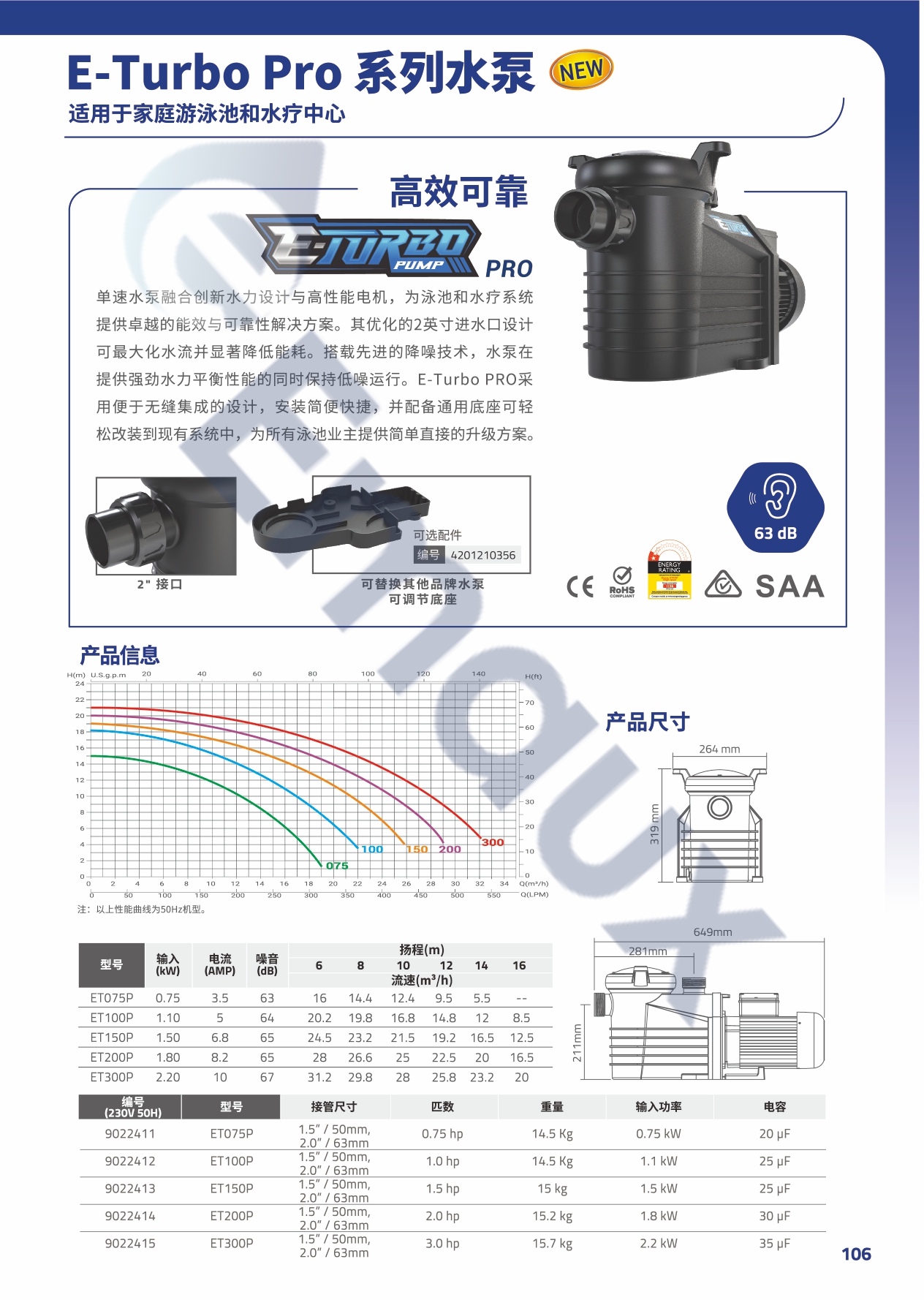 單速水泵融合創(chuàng)新水力設(shè)計(jì)與高性能電機(jī),為泳池和水療系統(tǒng) 提供卓越的能效與可靠性解決方案。其優(yōu)化的2英寸進(jìn)水口設(shè)計(jì) 可最大化水流并顯著降低能耗。搭載先進(jìn)的降噪技術(shù),水泵在 提供強(qiáng)勁水力平衡性能的同時(shí)保持低噪運(yùn)行。E-Turbo PRO采 用便于無縫集成的設(shè)計(jì),安裝簡(jiǎn)便快捷,并配備通用底座可輕 松改裝到現(xiàn)有系統(tǒng)中,為所有泳池業(yè)主提供簡(jiǎn)單直接的升級(jí)方案。