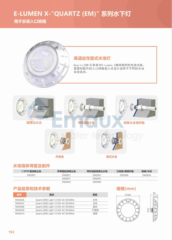 競(jìng)技池Quartz(EM)燈具有與E-Lumen X相同的先進(jìn)功能。壁管和配件的入口噴嘴旋入式設(shè)計(jì)適用于不同的水池安裝選項(xiàng)。