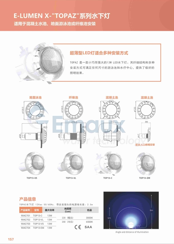 競(jìng)技池TOPAZ 是一款小巧而強(qiáng)大的13W LED水下燈。其纖細(xì)結(jié)構(gòu)和多種安裝方式可滿足任何尺寸的游泳池和水療中心,提供了極好的照明效果。